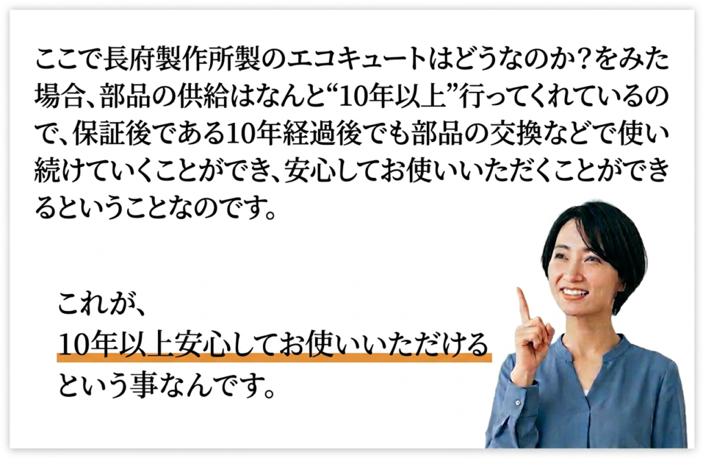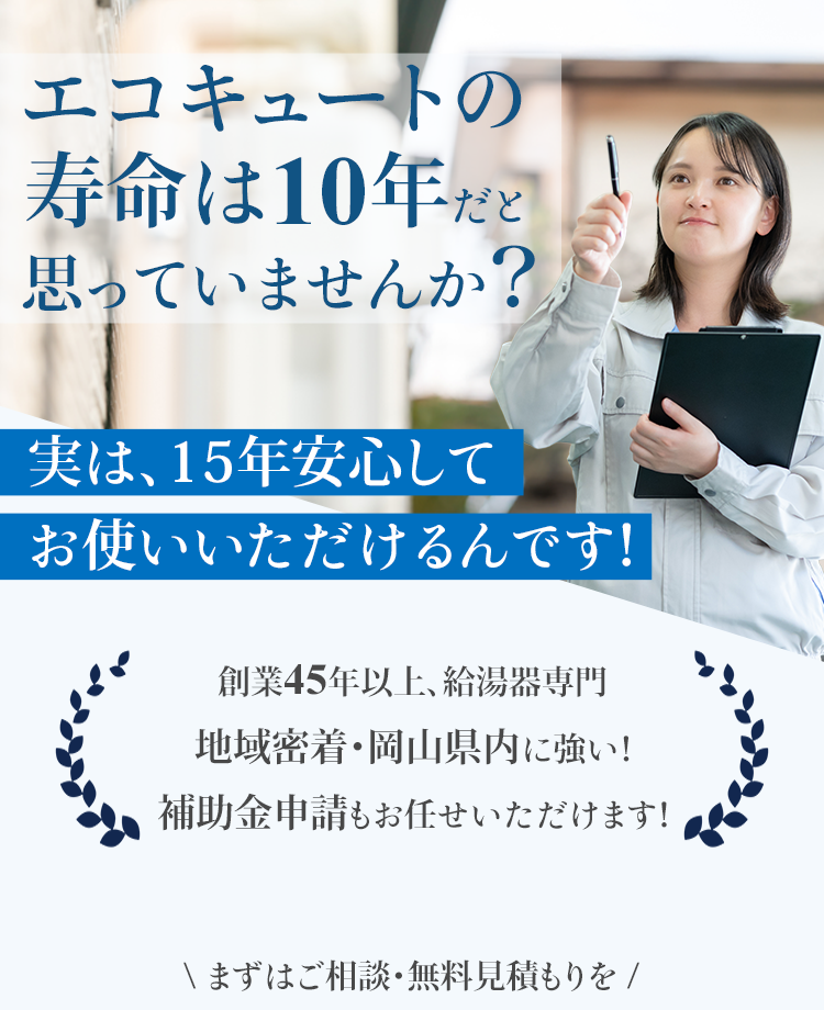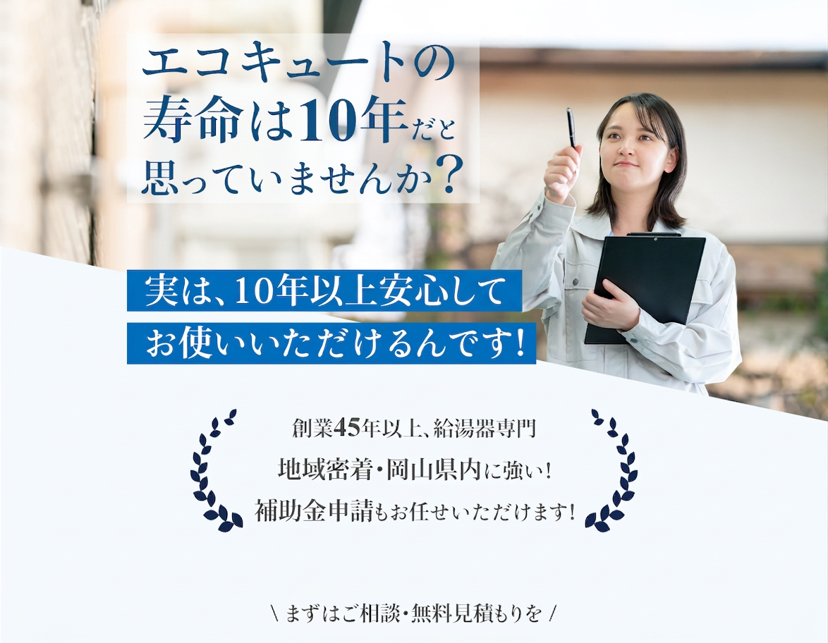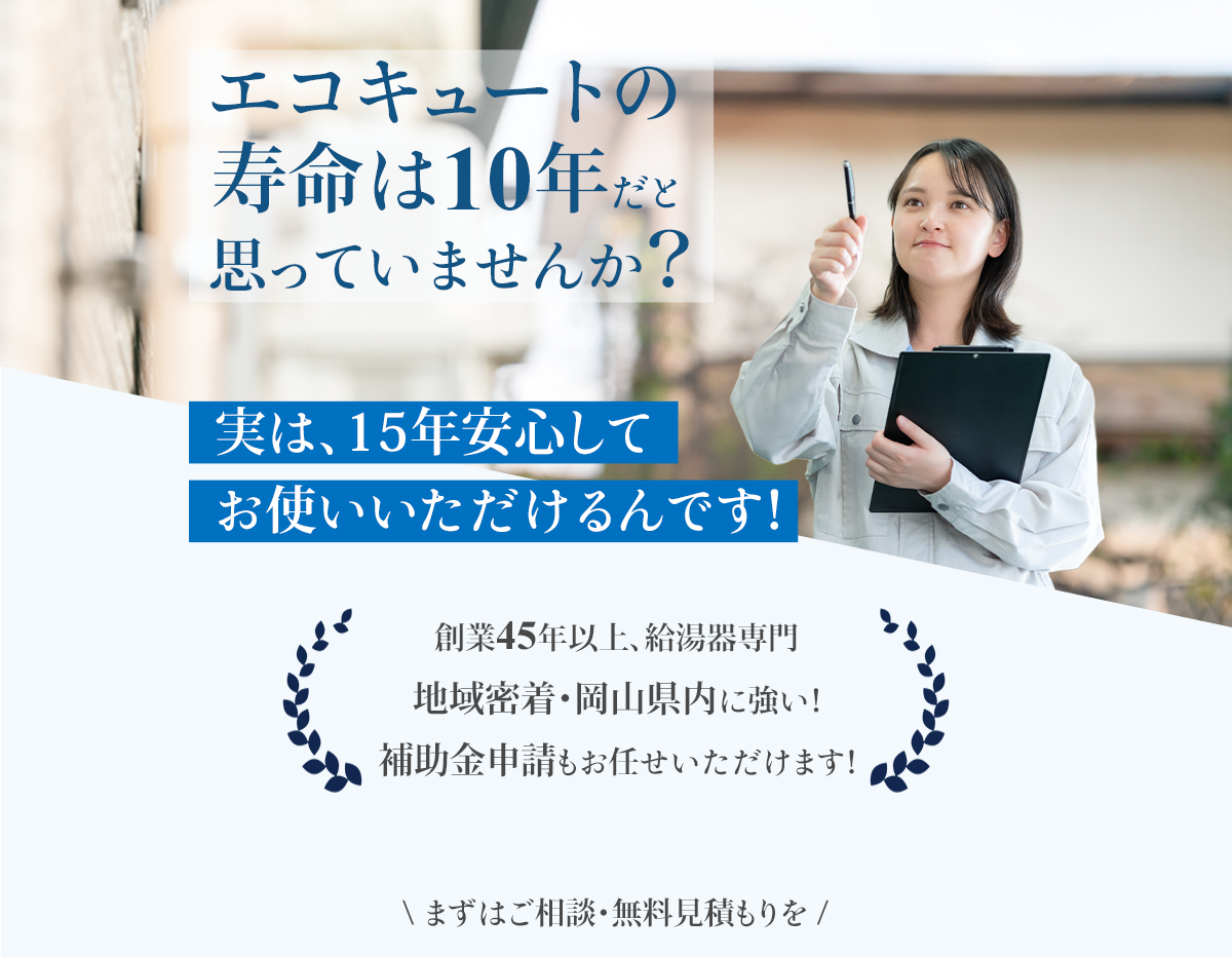 例えば2年落ちのエコキュートを購入した場合、発売から2年経過しているので部品の供給期間は8年になります。もちろん、在庫があって8年経過後でも修理できることはありますが、可能性は下がっていくと思っていただいて問題ありません。